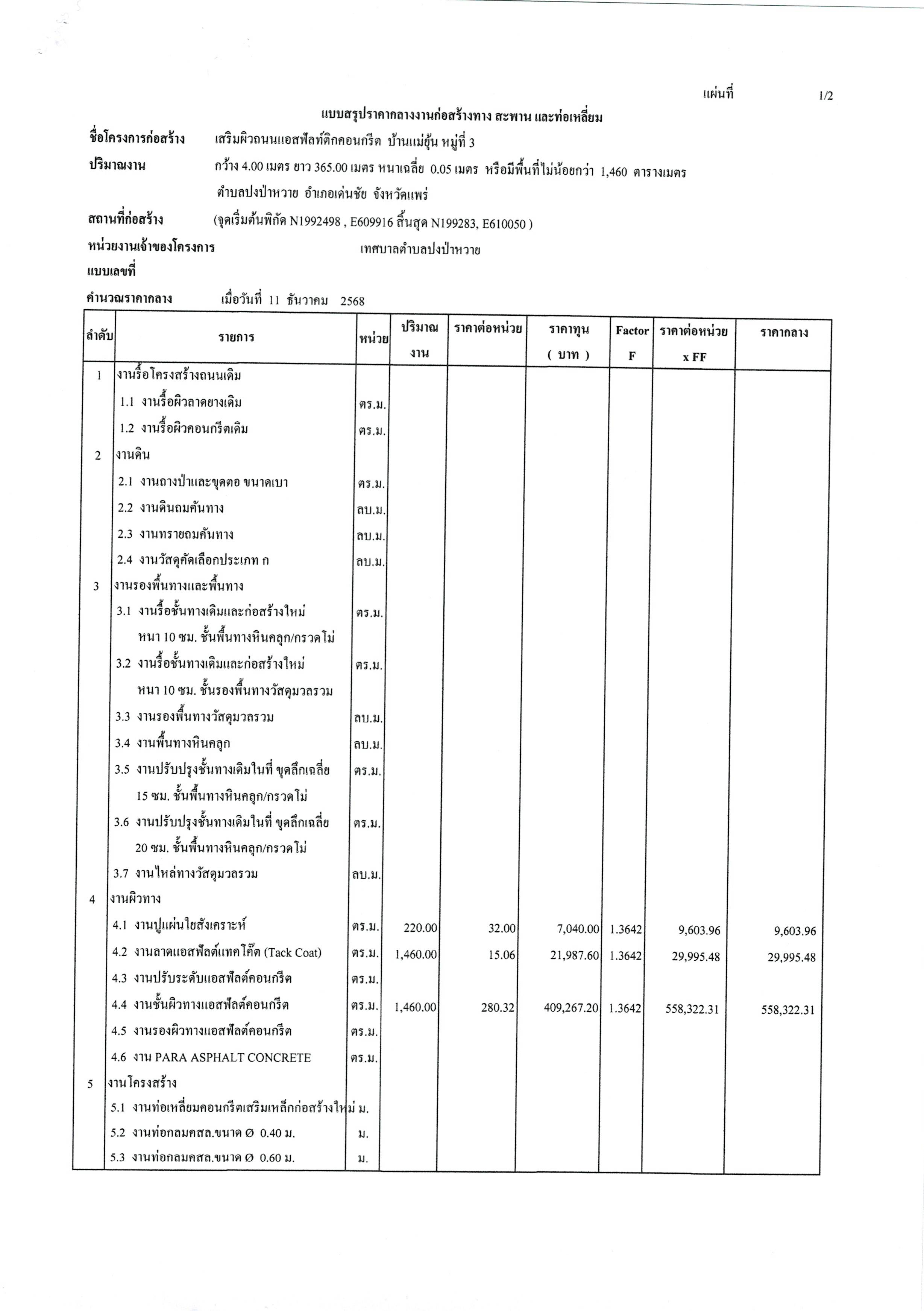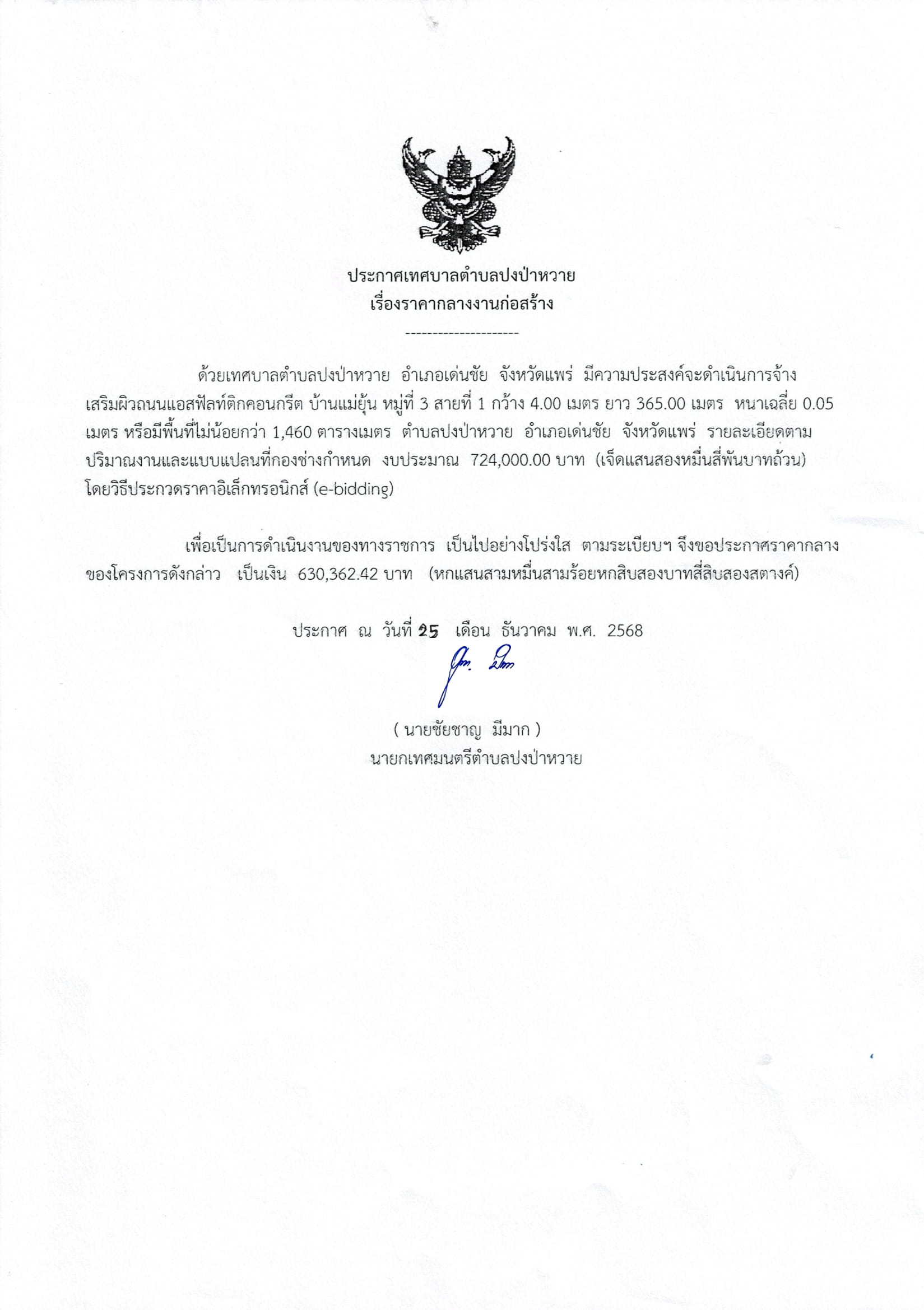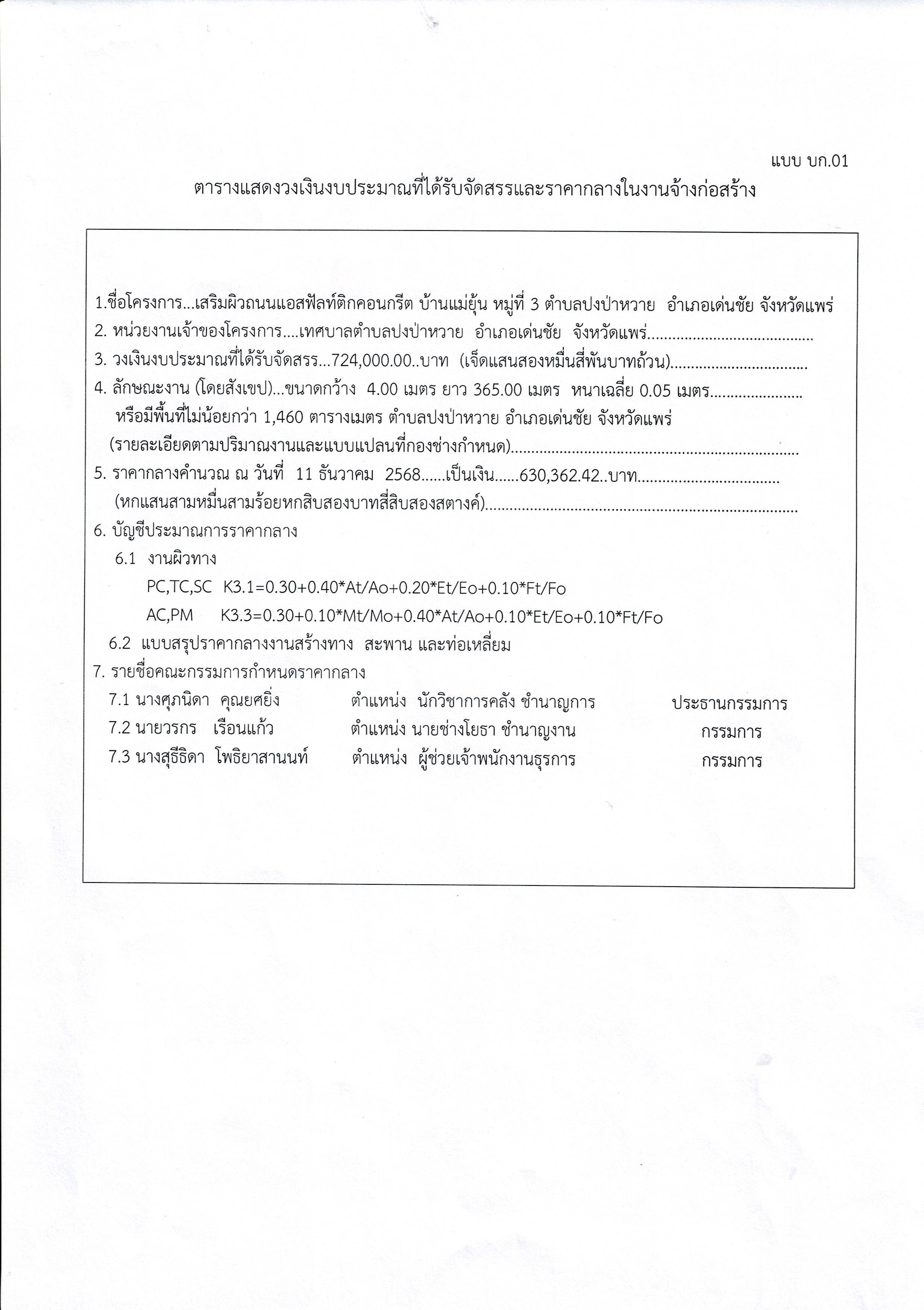ประกาศเทศบาลตำบลปงป่าหวาย เรื่อง ราคากลางงานก่อสร้าง โครงการจ้างเสริมผิวถนนแอสฟัลท์ติกคอนกรีต บ้านแม่ยุ้น หมู่ที่ 3