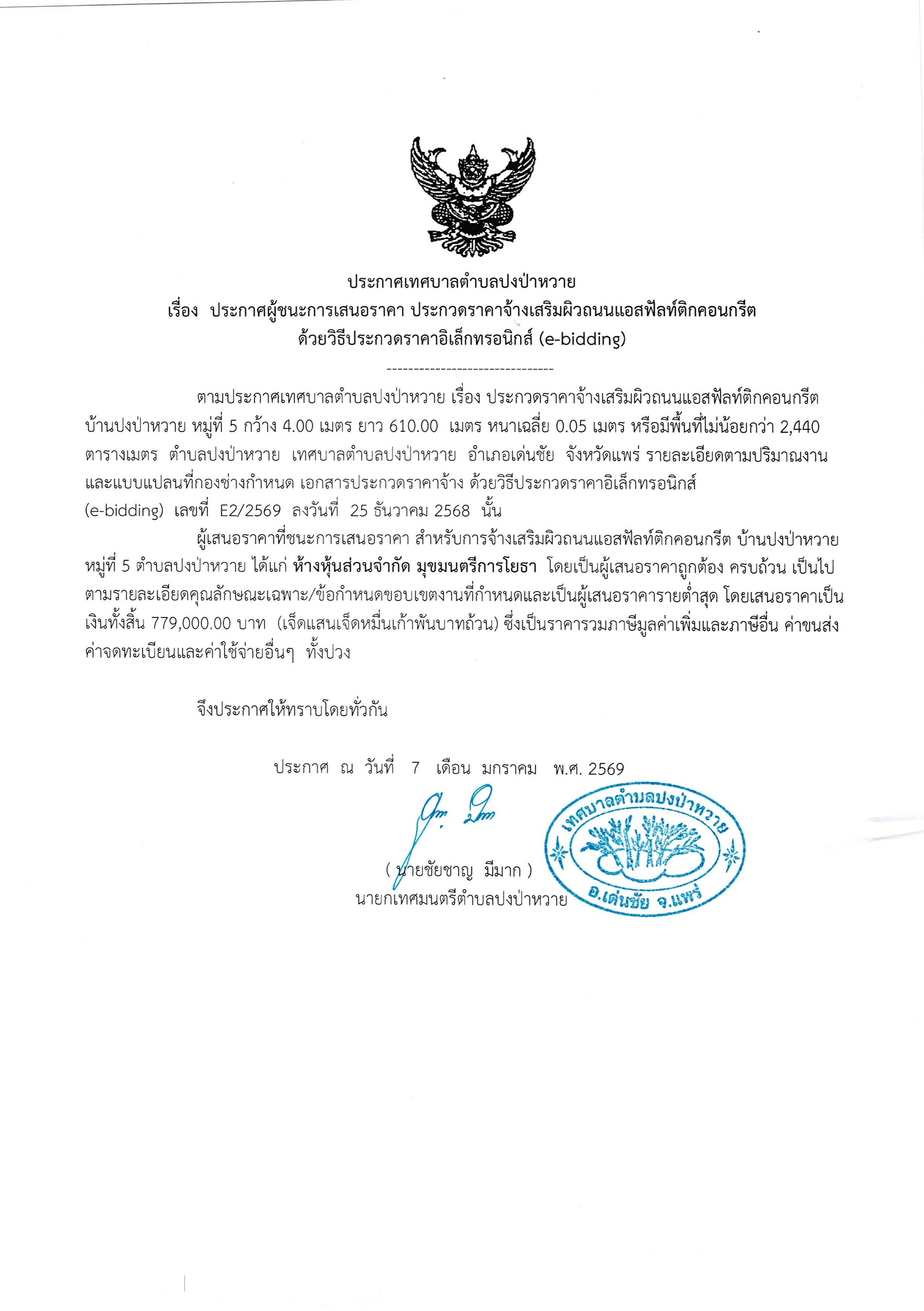 ประกาศเทศบาลตำบลปงป่าหวาย เรื่อง ประกาศผู้ชนะการเสนอราคา ประกวดราคาจ้างเสริมผิวถนนแอสฟัลท์ติกคอนกรีตด้วยวิธีประกวดราคาอิเล็กทรอนิกส์(e-bidding) หมู่ที่ 5
