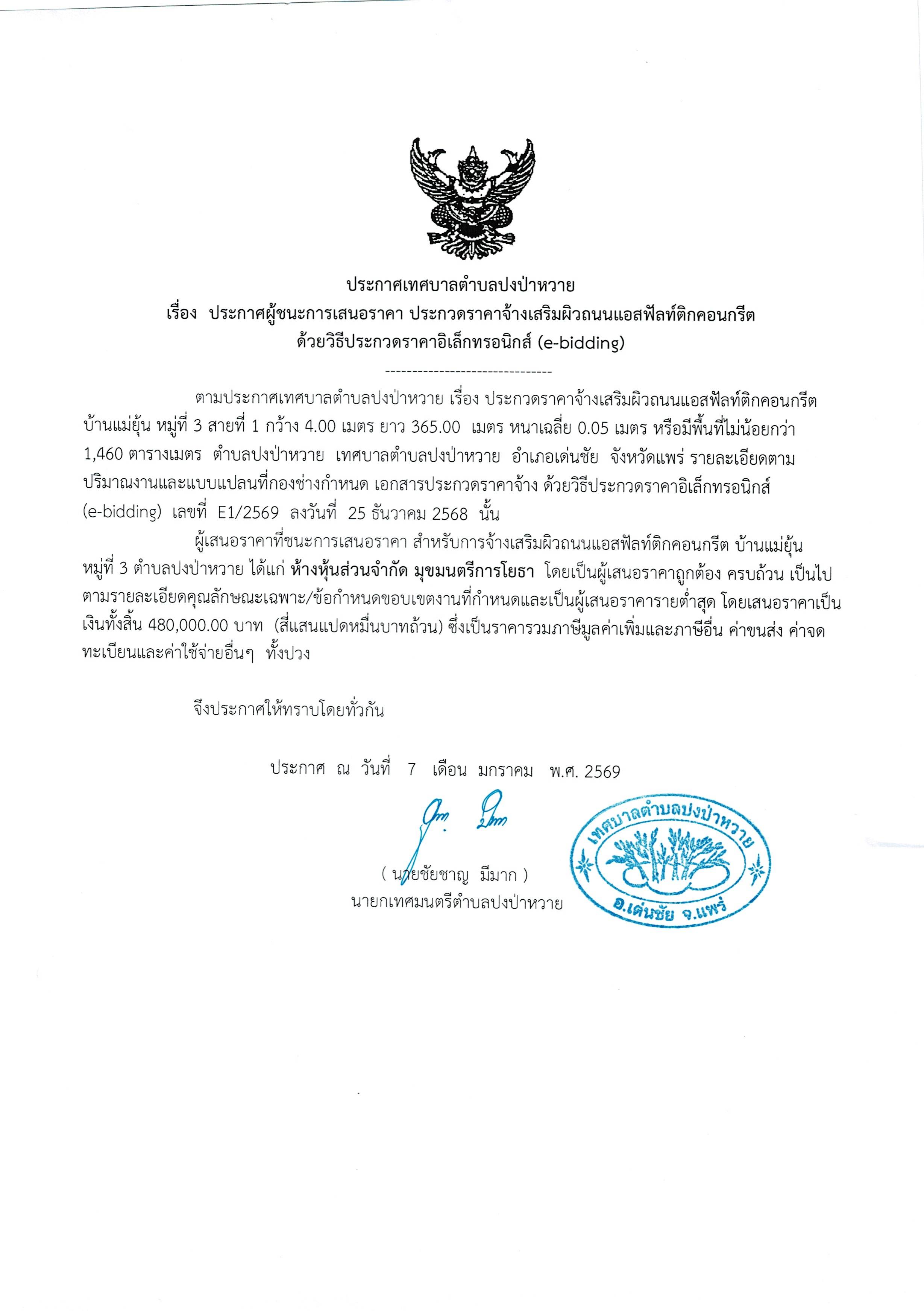 ประกาศเทศบาลตำบลปงป่าหวาย เรื่อง ประกาศผู้ชนะการเสนอราคา ประกวดราคาจ้างเสริมผิวถนนแอสฟัลท์ติกคอนกรีตด้วยวิธีประกวดราคาอิเล็กทรอนิกส์(e-bidding) หมู่ที่ 3