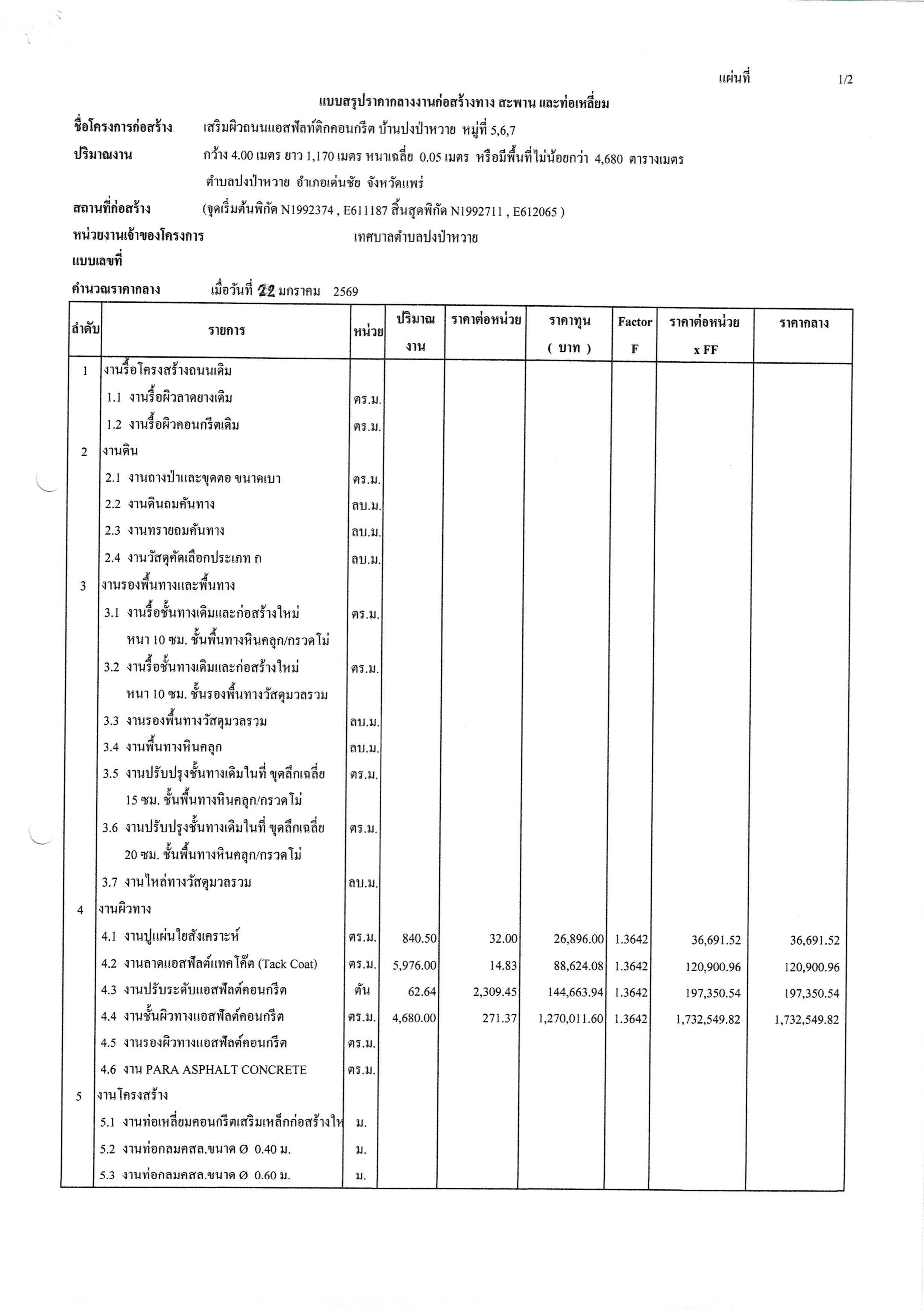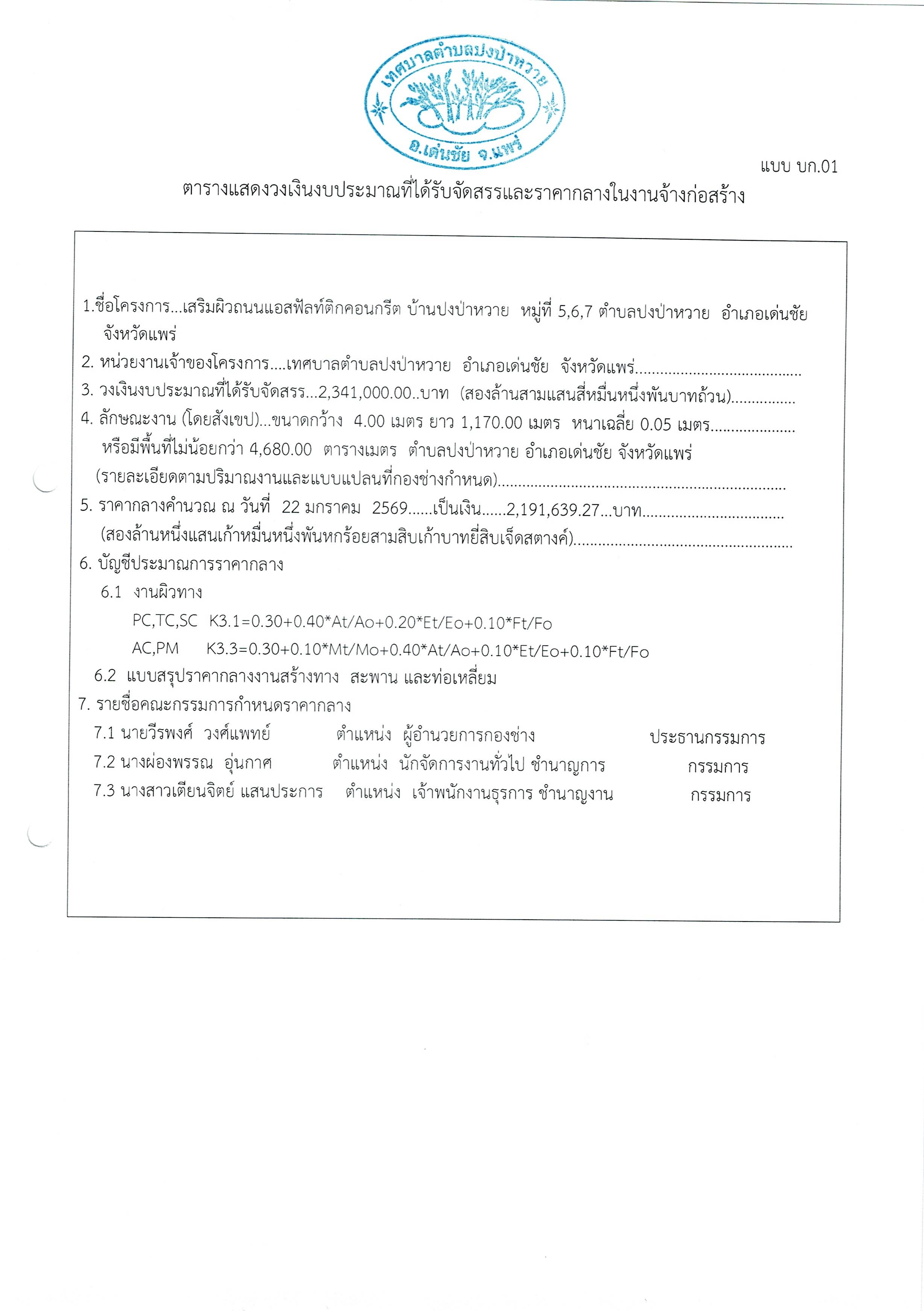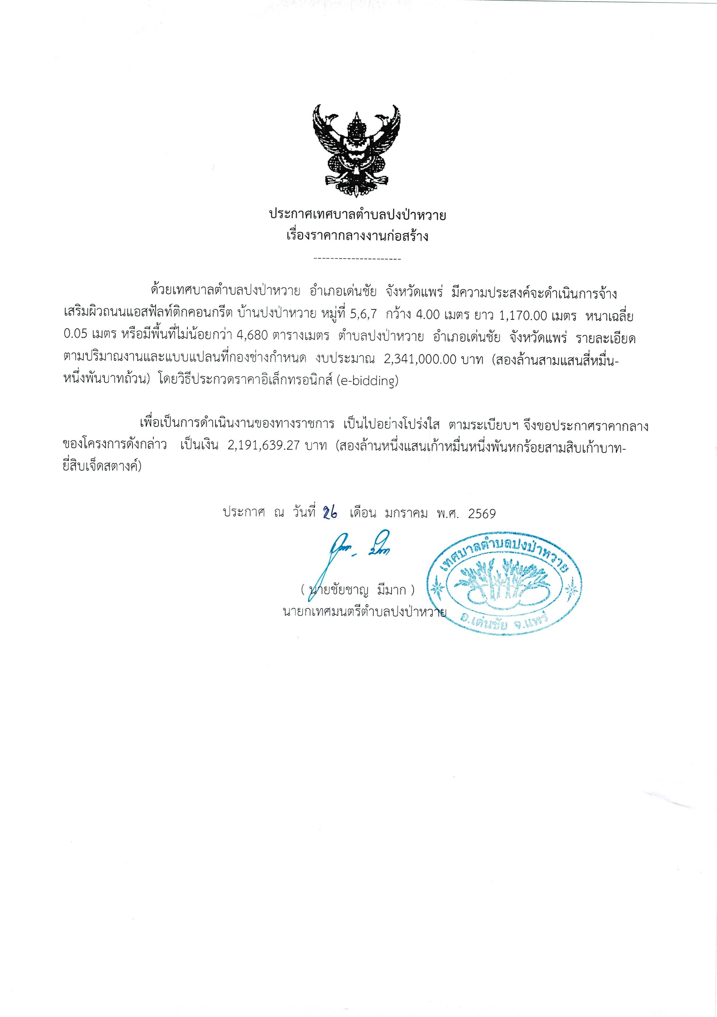 ประกาศเทศบาลตำบลปงป่าหวาย เรื่อง ราคากลางงานก่อสร้าง โครงการเสริมผิวถนนแอสฟัลท์ติกคอนกรีต บ้านปงป่าหวาย หมู่ที่ 5,6,7