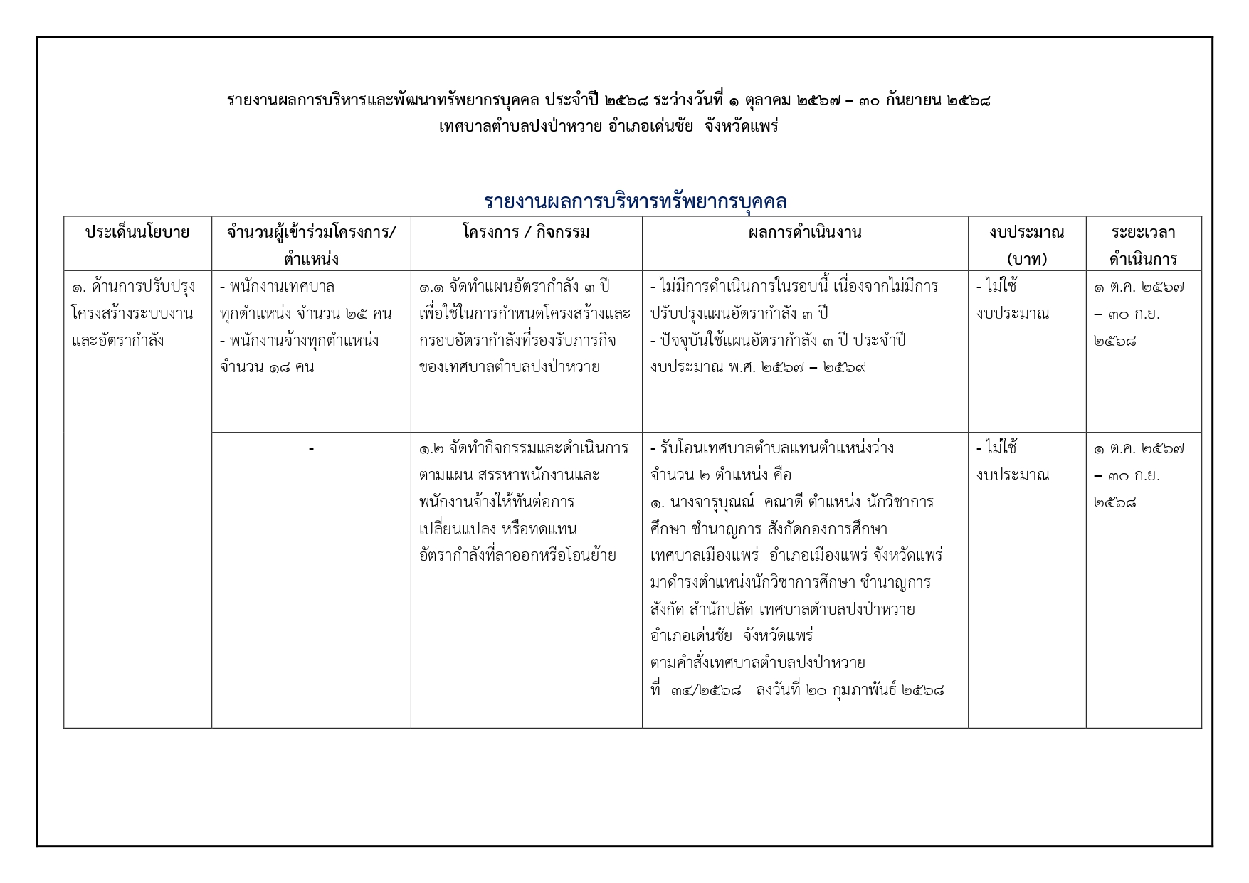 รายงานผลการบริหารและพัฒนาทรัพยากรบุคคลประจำปี พ.ศ. 2568